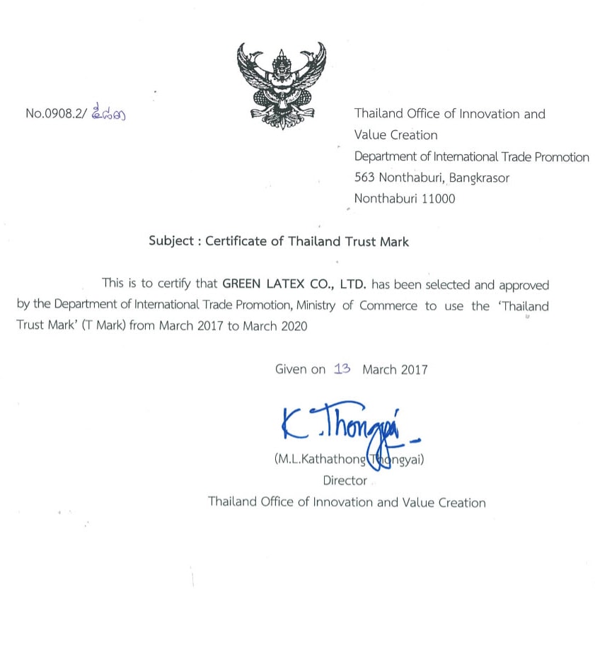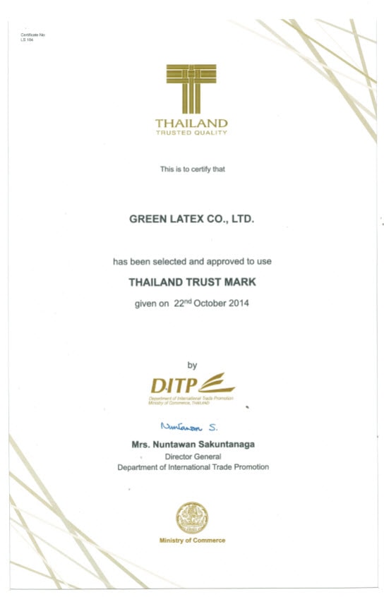 เรามีชื่อเสียงในการผลิตที่นอนยางพารา และด้วยประสิทธิภาพการผลิตชั้นสูงของ กรีนลาเท็กซ์ ในการเลือกใช้น้ำยางพาราธรรมชาติคุณภาพดี มีการนำเทคโนโลยีที่คิดค้นและพัฒนามาใช้ในกระบวนการผลิตภายใต้คอนเซปต์ “INNOVATIVE SOLUTION FOR BETTER SLEEP” ทำให้ผลิตภัณฑ์ที่นอนยางพาราของเรา ได้รับการตอบรับเพิ่มขึ้นอย่างต่อเนื่อง รับประกันคุณภาพด้วย ตราสัญลักษณ์รับรองคุณภาพสินค้า “Thailand Trust Mark “ ที่กำหนดขึ้นเพื่อส่งเสริมคุณค่าของสินค้าและบริการของไทยที่ผลิตในประเทศไทย เพื่อให้คนไทยมีโอกาสได้ใช้สินค้าที่มีคุณภาพเทียบเท่าระดับโลก