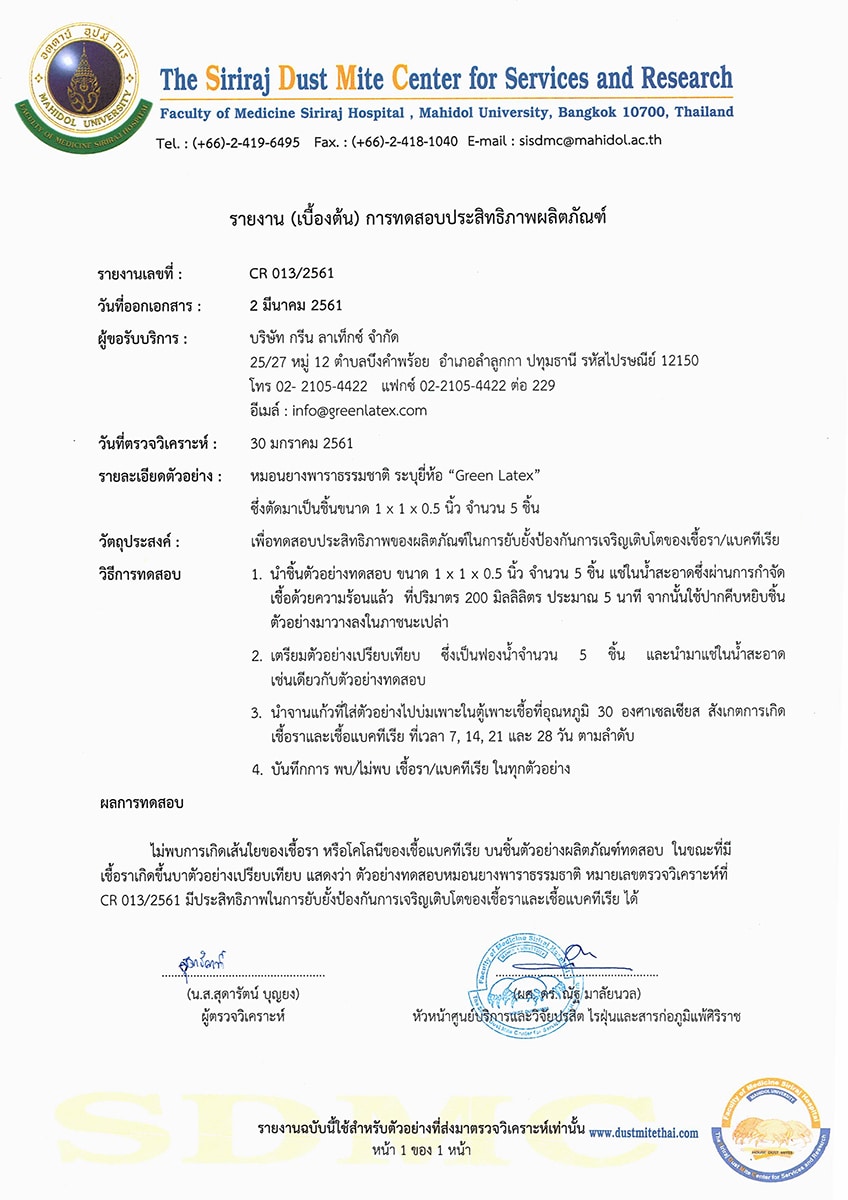 SDMC (Siriraj Dust Mite Center) — это первая в Азии лаборатория, выполняющая проверку на бактерии и пылевых клещей в постельных принадлежностях и других материалах. За более чем 10 лет работы накоплено множество исследования и инноваций по методам тестирования и проверки. Основное внимание лаборатории уделяется контролю за распространением пылевых клещей и их аллергенов. Продукция компании Green Latex прошла все испытания, получила сертификат качества, признана безопасной для использования и предотвращающей развитие пылевых клещей и бактерий.
