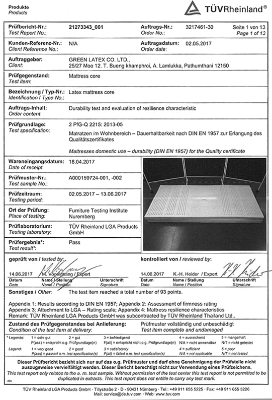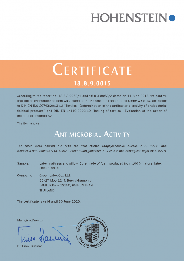 ผ่านการทดสอบตามมาตรฐานของ DIN-EN ISO 20743:2013-12 โดย Hohenstein Laboratories GmbH & Co. KG ผลปรากฏว่าหมอน และที่นอนยางพาราธรรมชาติ ของ Green Latex มีความสามารถในการต่อต้านและยับยั้งการเจริญเติบโตของเชื้อรา และแบคทีเรีย
