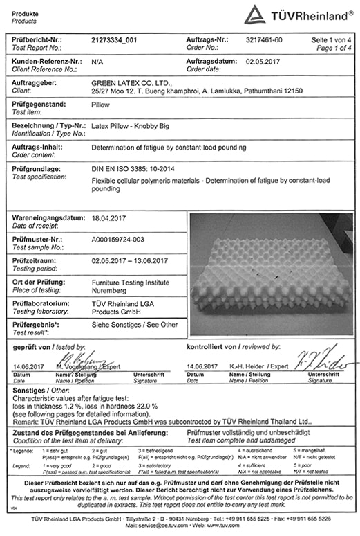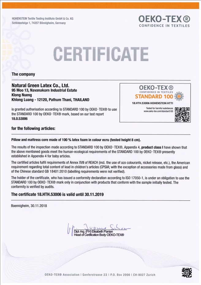 ผลการตรวจสอบจาก Oeko-Tex Standard 100 ผลิตภัณฑ์ของ กรีนลาเท็กซ์ จัดอยู่ในระดับ Product Class 1 สินค้าประเภทสิ่งทอสำหรับทารก เด็กและผู้ใหญ่ เป็นผลิตภัณฑ์ที่ไม่มีอันตรายจากสารตกค้าง โดยผลการทดสอบจากสถาบันสิ่งทอยืนยันว่า Oeko-Tex Standard 100 ช่วยสร้างความเชื่อมั่นและความน่าเชื่อถือในตัวผลิตภัณฑ์ได้มากยิ่งขึ้น