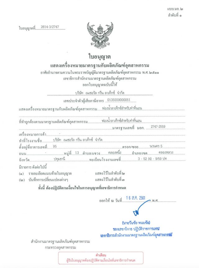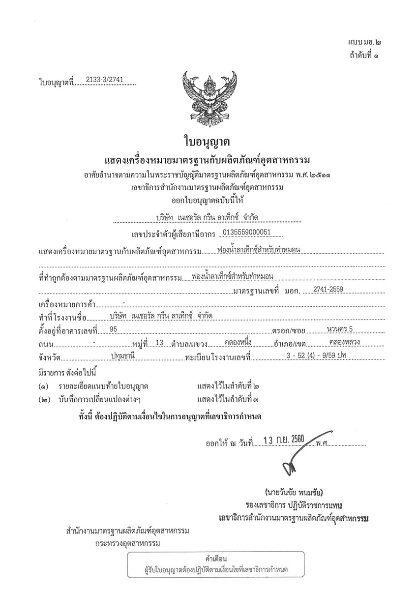 กรีนลาเท็กซ์ ได้ผ่านการรับรอง ” มาตรฐานผลิตภัณฑ์อุตสาหกรรม “ หรือ “ มอก.” ซึ่งเป็นการกำหนดมาตรฐานด้านการผลิตสินค้าที่มึคุณภาพอย่างสม่ำเสมอ และ ผู้บริโภคได้สินค้าคุณภาพดีขึ้นในราคาที่เป็นธรรมคุ้มค่ากับการใช้งาน สร้างความเข็มแข็งให้กับอุตสาหกรรมและเศรษฐกิจของประเทศ