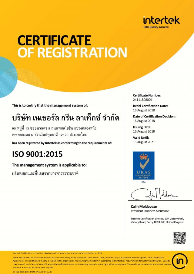 GreenLatex ได้รับการรับรองระบบ บริหารงานคุณภาพ ISO 9001 : 2015 จากความมุ่งมั่นพัฒนาและปรับปรุงระบบบริหารงานคุณภาพอย่างต่อเนื่อง โดยนำระบบมาตรฐานสากล หรือ ISO (International Organization for Standardization) เป็นแกนหลักเพื่อช่วยในการดำเนินธุรกิจให้ลูกค้าเกิดความพึงพอใจสูงสุดได้รับการรับรองคุณภาพโดย UKAS : United Kingdom Accreditation Service