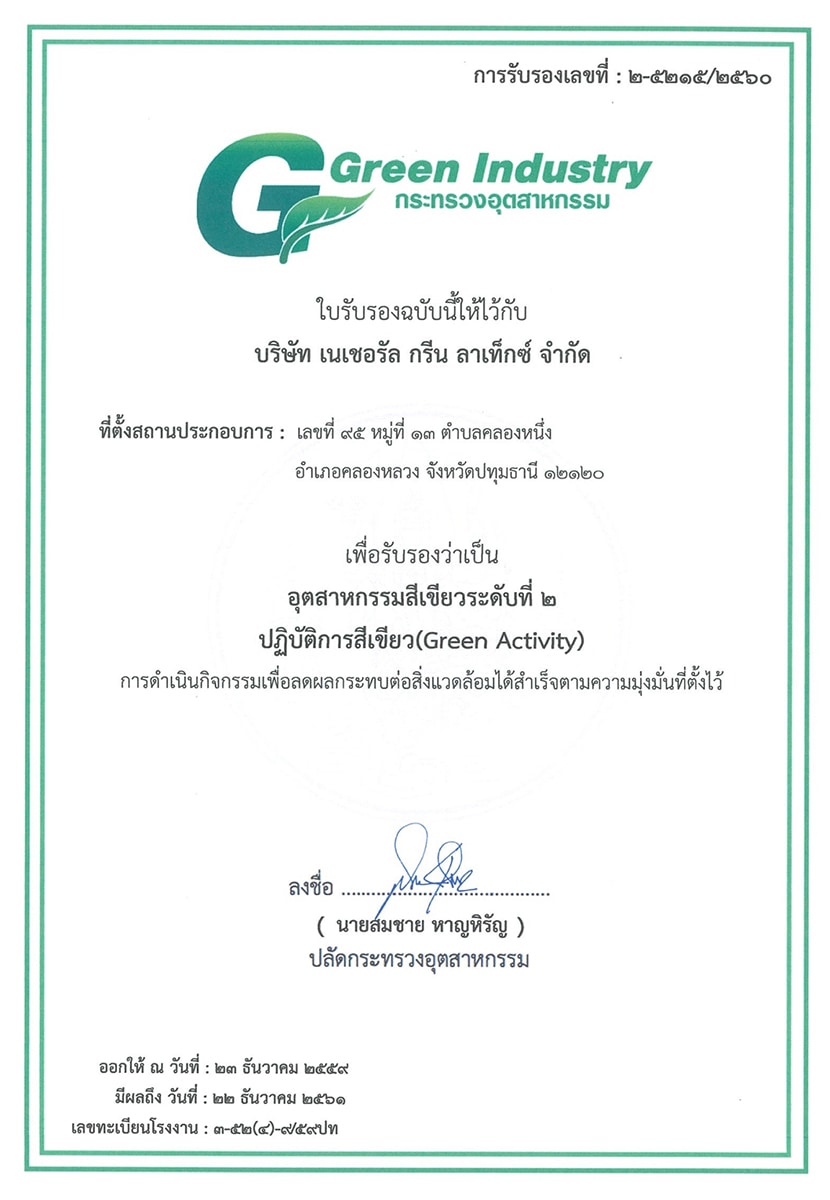 Ратифицировав декларации с саммитов в Йоханесбурге в 2002 году и в Маниле в 2009 году, Министерство Промышленности Таиланда стало ведущим департаментом по устойчивому развитию страны и руководит проектом "Green Industry". Его цель — развитие экологичного и безопасного производства для окружающей среды и общества. Компания Green Latex осознала влияние на окружающую среду, взяла обязательства вести бизнес согласно мировым стандартам и получила сертификат "Зелёная Промышленность Уровня 2" (Green Activity).
